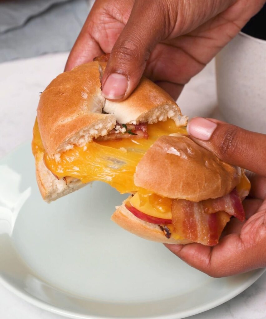- Preheat oven to 350°F. Top the bottom half of each bagel evenly with turkey, apple slices, cheddar, bacon, thyme and then the top half of each bagel.