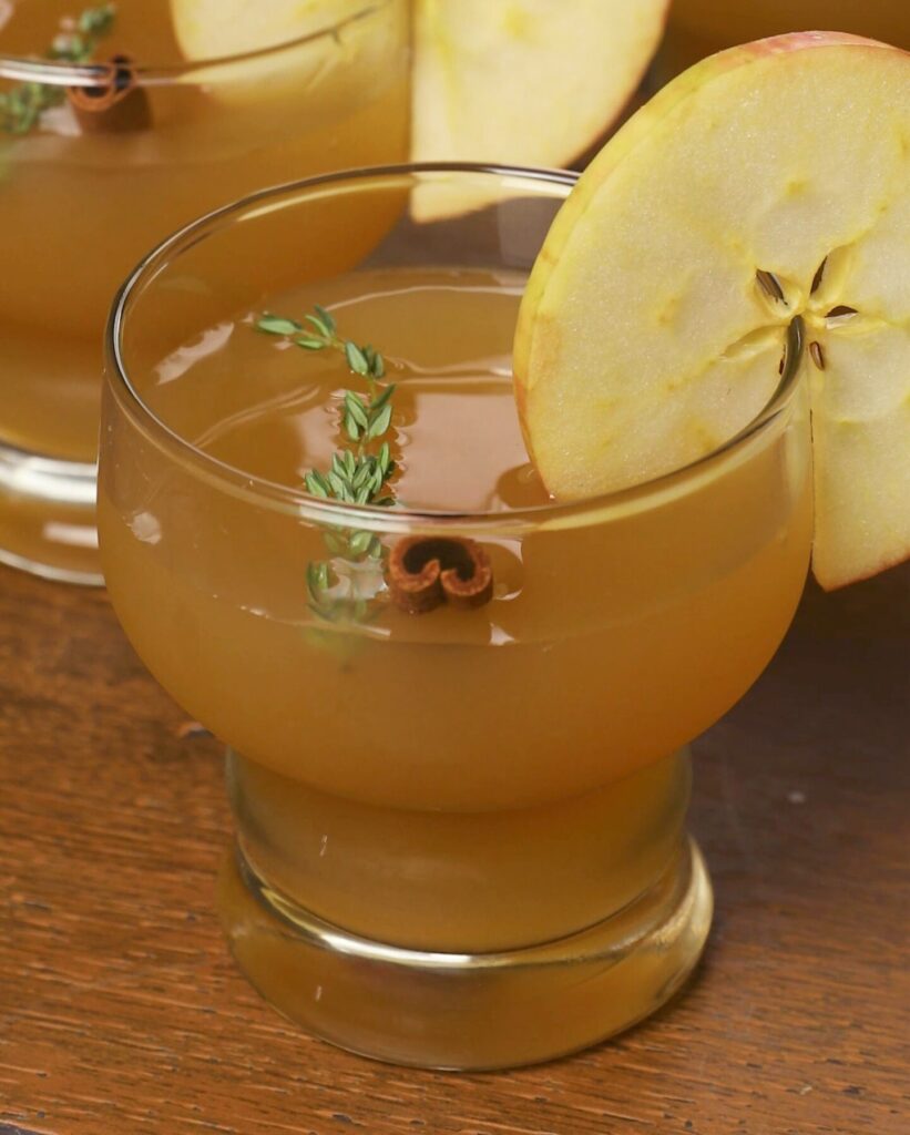 2. Divide drink serving glasses. Garnish rim of glasses with apple slices. Place a cinnamon stick and thyme sprig in each glass. Serve and enjoy.