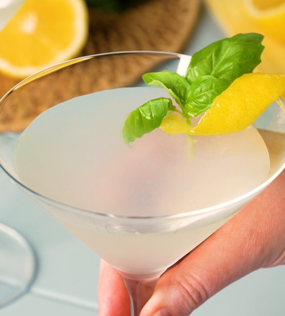 3. Double strain lemonade mixture into a chilled martini glass. Garnish with a sprig of basil and lemon peel. Serve and enjoy.