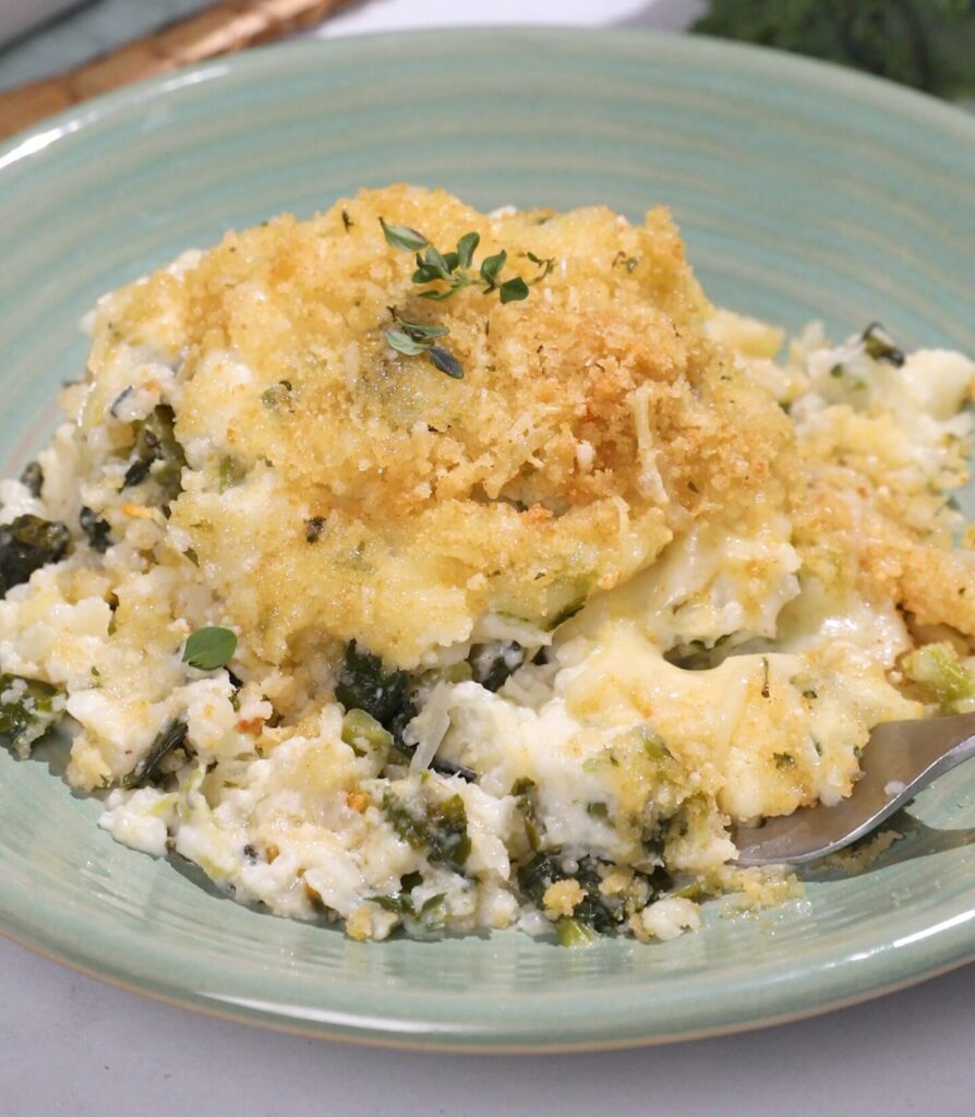 3. Add cauliflower, kale and cheese sauce to prepared baking dish and mix gently to combine.