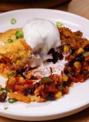 - Divide chili among serving bowls. Top with a dollop of sour cream, cheddar, avocado and red onion. Garnish with cilantro and serve.