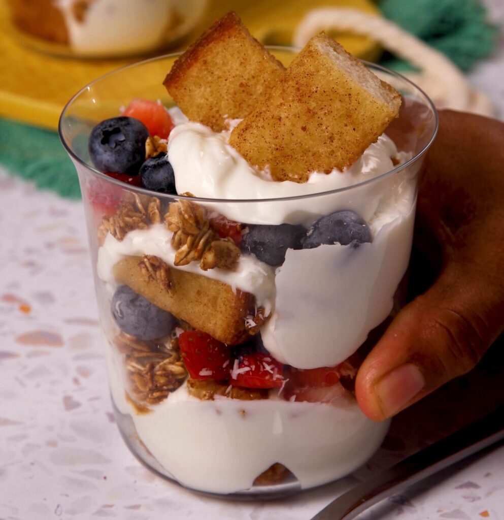 2. Place a few French toast pieces in the bottom of 4 parfait glasses or jars. Layer evenly with yogurt, granola, strawberries, blueberries and coconut. Repeat 2 to 3 times, ending with a layer of French toast pieces, until the parfait glasses are full. Drizzle with maple syrup, and serve.