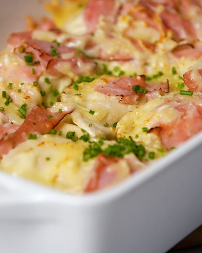 - Spread roughly 1 cup of sauce evenly over the bottom of the prepared baking dish. Scatter half of the ham evenly over the sauce, then top with 1 cup of Gruyere cheese. Shingle pierogies evenly over Gruyere cheese and ham. Drizzle with remaining sauce. Scatter remaining ham over sauce and top with remaining Gruyere cheese.