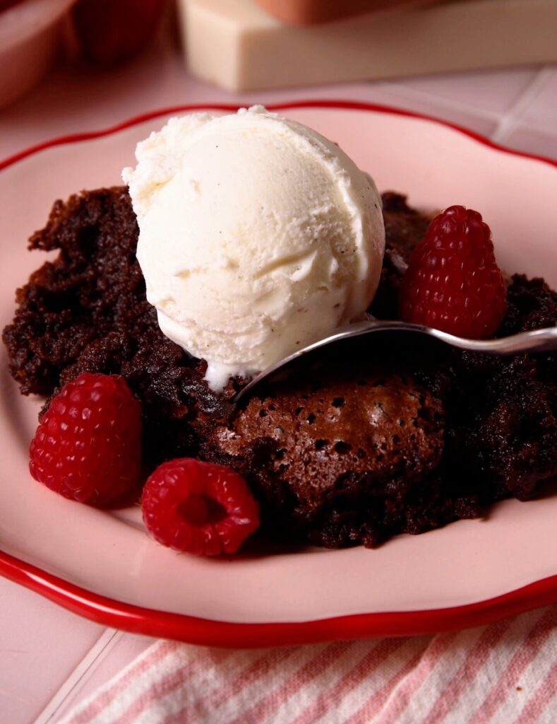 - Allow to cool at room temperature for at least 5 minutes. Serve with raspberries and ice cream.