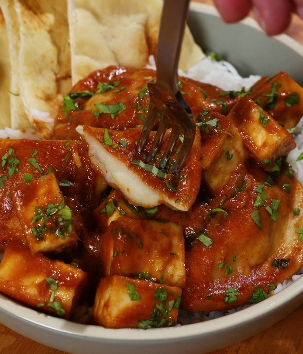 3. Garnish with cilantro, and serve with rice and naan.