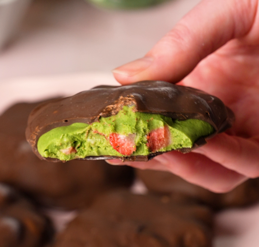 - Place chocolate in a small microwave-safe bowl. Microwave on high in 30-second increments, stirring between each increment, until melted and smooth. Dip each frozen cluster into chocolate to coat. Transfer clusters back to prepared baking sheet. Freeze until chocolate is set, about 5 minutes.