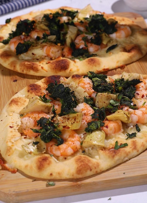 2. Place naan on a rimmed baking sheet. Sprinkle cheese evenly over each naan, leaving a 1/2-inch border. Top with an even layer of shrimp, artichokes and spinach. Bake until cheese is melted, about 5 to 8 minutes. Garnish with crushed red pepper flakes and oregano, and serve.