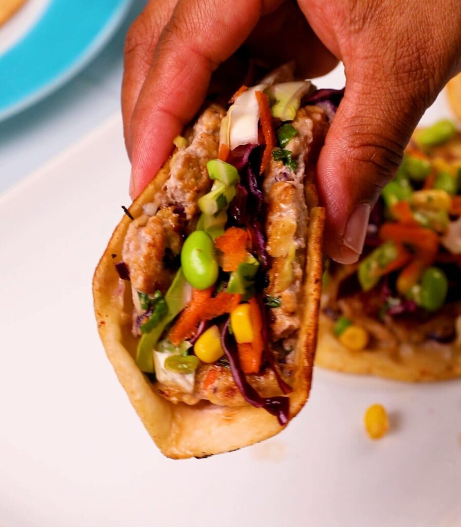 - For slaw and assembly: While tacos are cooking, combine coleslaw, edamame, corn, cilantro and green onions, sesame oil, vinegar and sugar together until coated. Season with salt and pepper, to taste.