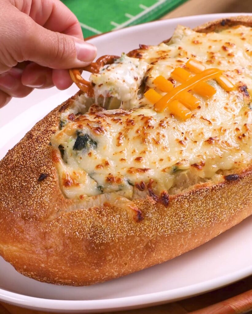 - Preheat oven to 375°F and line a rimmed baking sheet with parchment paper. Cut out the top-third of loaf of bread in the shape of a football. Carefully hollow out bottom leaving a 1-inch shell of bread intact for support. Reserve hollowed out bread pieces for serving.