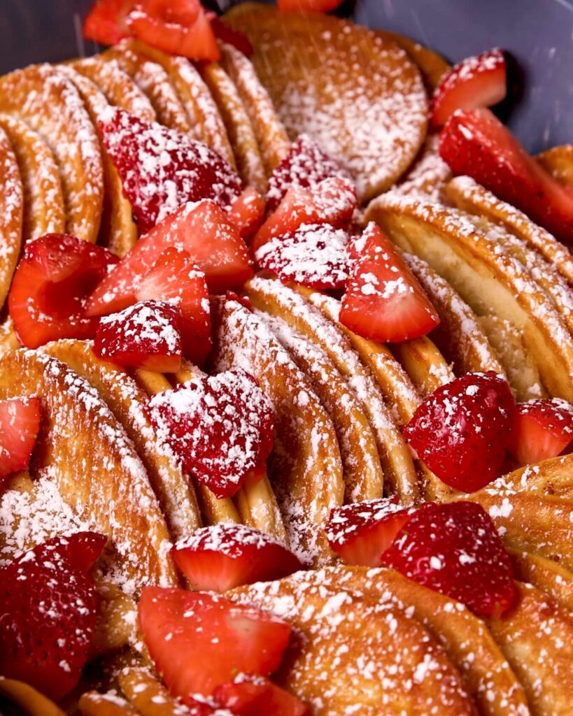 4. Top with strawberries and dust with powdered sugar. Slice and serve with whipped cream.