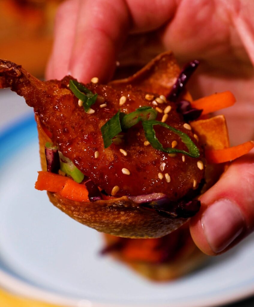 - Fill each wonton cup evenly with cabbage mixture and top with shrimp. Garnish with green onions and sesame seeds. Serve and enjoy.