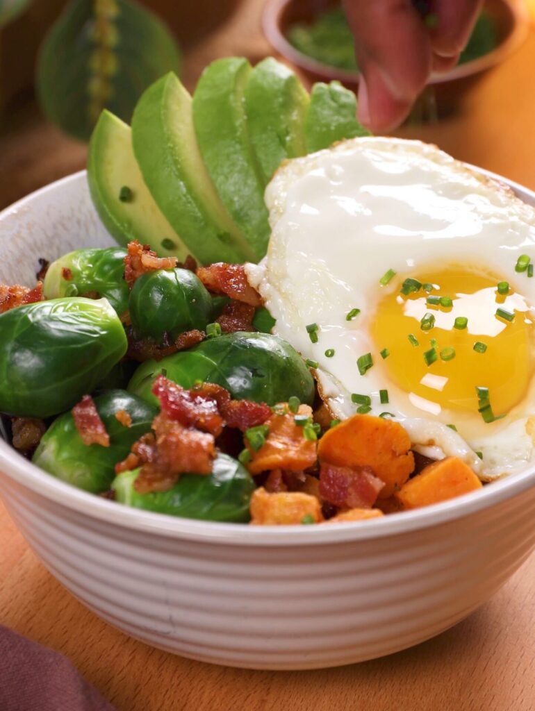 - Divide sweet potatoes between 2 bowls. Top evenly with Brussels sprouts, bacon and avocado. Garnish with chives, and serve.