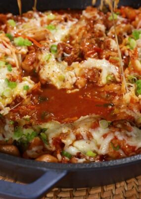 - Meanwhile, to make the Alfredo Sauce; in a large saucepan over medium heat, heat oil until hot. Add garlic and cook 1 minute, stirring occasionally making sure it doesn’t burn. Whisk in flour and cook 1 minute or until golden.